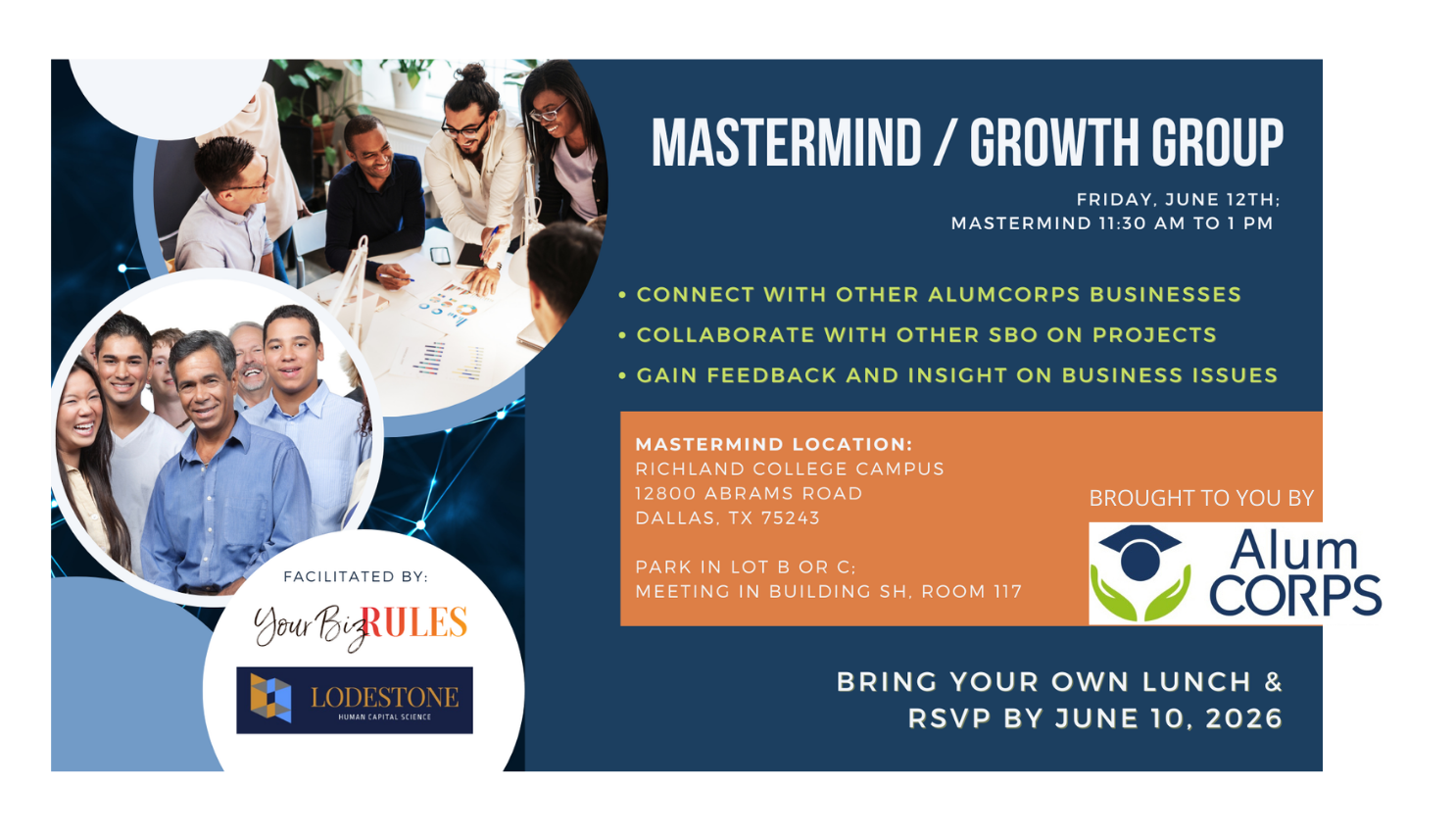 Event Details Date: Friday, June 12, 2026 Time: 11:30 AM – 1:00 PM Location Richland College – Dallas 12800 Abrams Road, Dallas, TX 75243 Bring your own lunch and join us for a practical conversation with other business owners. RSVP by June 10, 2026