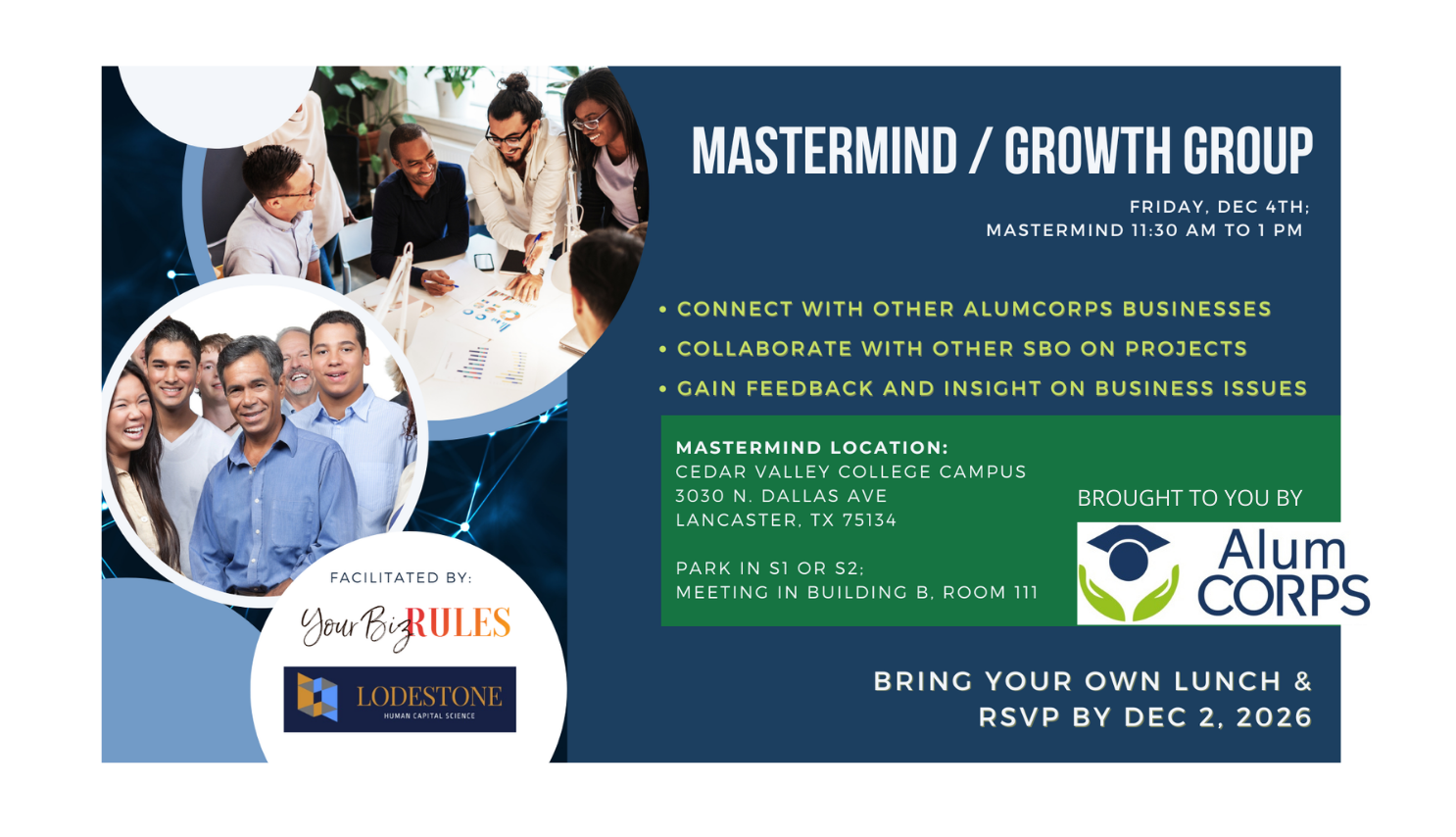 Running a business can feel isolating, even when things are going well. Most owners don’t have a room full of peers they can turn to when they’re facing a tough decision or a growth challenge. That’s exactly why AlumCorps is hosting a Mastermind/Growth Group for business owners in the ecosystem. This is not a lecture or a panel. It’s a facilitated working session designed to help business owners think through real challenges with other founders who understand what it takes to run and grow a company. During the mastermind session, you will: • Connect with other AlumCorps businesses • Collaborate with other small business owners on real challenges • Gain feedback and insight on issues you’re currently facing in your business